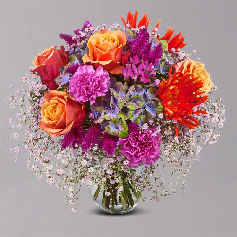 Fünf orange-rote Rosen sorgen in Verbindung mit zwei orangefarbenen Germini für eine farbenfrohe Blütenexplosion, die von drei pinkfarbenen Celosien und zwei pinkfarbenen Nelken auf einzigartige Weise unterstrichen wird. Eine blau-grüne Hortensie sowie eine pinkfarbene Bouvardie runden das farbstarke Blütenspektakel harmonisch ab. Umrahmt wird die exklusive Floristikkomposition von zartrosafarbenem, luftigem Schleierkraut, das für das Sahnehäubchen auf der knalligen Kreation sorgt.