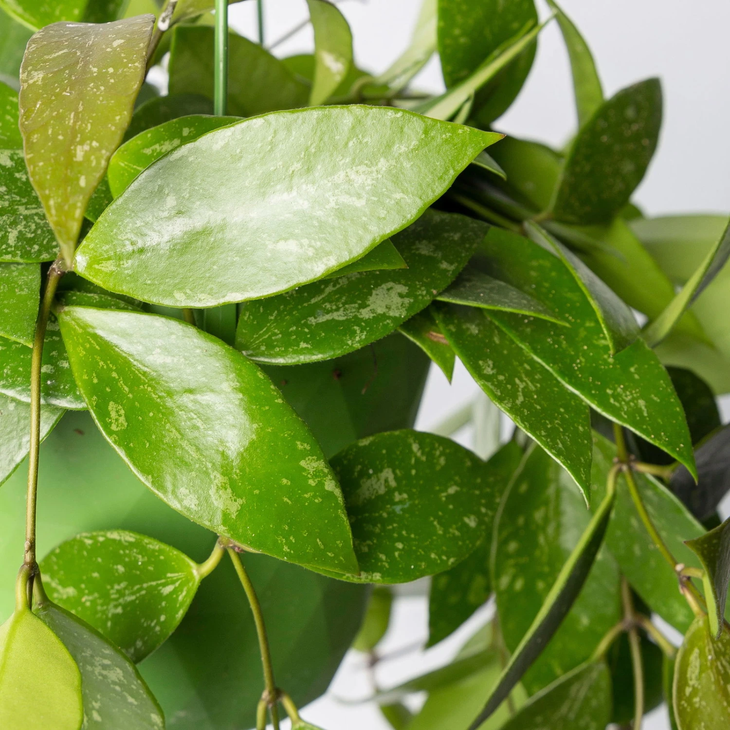 Die Wachsblume (Hoya memoria syn. H. gracilis), zählt zu den Sukkulenten und stammt ursprünglich aus Asien. Die Pflanze zählt zu den Aufsitzerpflanzen (Epiphyten) und wächst am Naturstandort auf den Ästen größerer Bäume. Charakteristisch sind die grün glänzenden, elliptischen Blätter, die außergewöhnlich derb und dickfleischig sind. Besonders dekorativ sind die silbrigen Sprenkel, die jedes Blatt unterschiedlich zeichnen. Die Wachsblume bildet lange Ranken aus und eignet sich daher optimal für die Kultur in einer Blumenampel. Bei guter Pflege können diese Ranken über einen Meter lang werden.