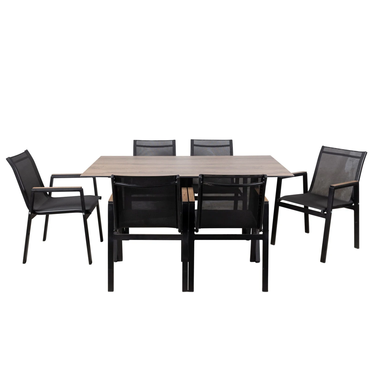 Der Stapelsessel in zeitlosem Look punktet mit einer durchdachten Materialkombination aus Alu und Textil. Die Armlehnen in Holzoptik verleihen dem Möbelstück einen schicken, rustikalen Akzent. Als Element einer Essgruppe oder als eine unkomplizierte Sitzgelegenheit im Garten macht dieser schwarze Stapelsessel eine gleich gute Figur.